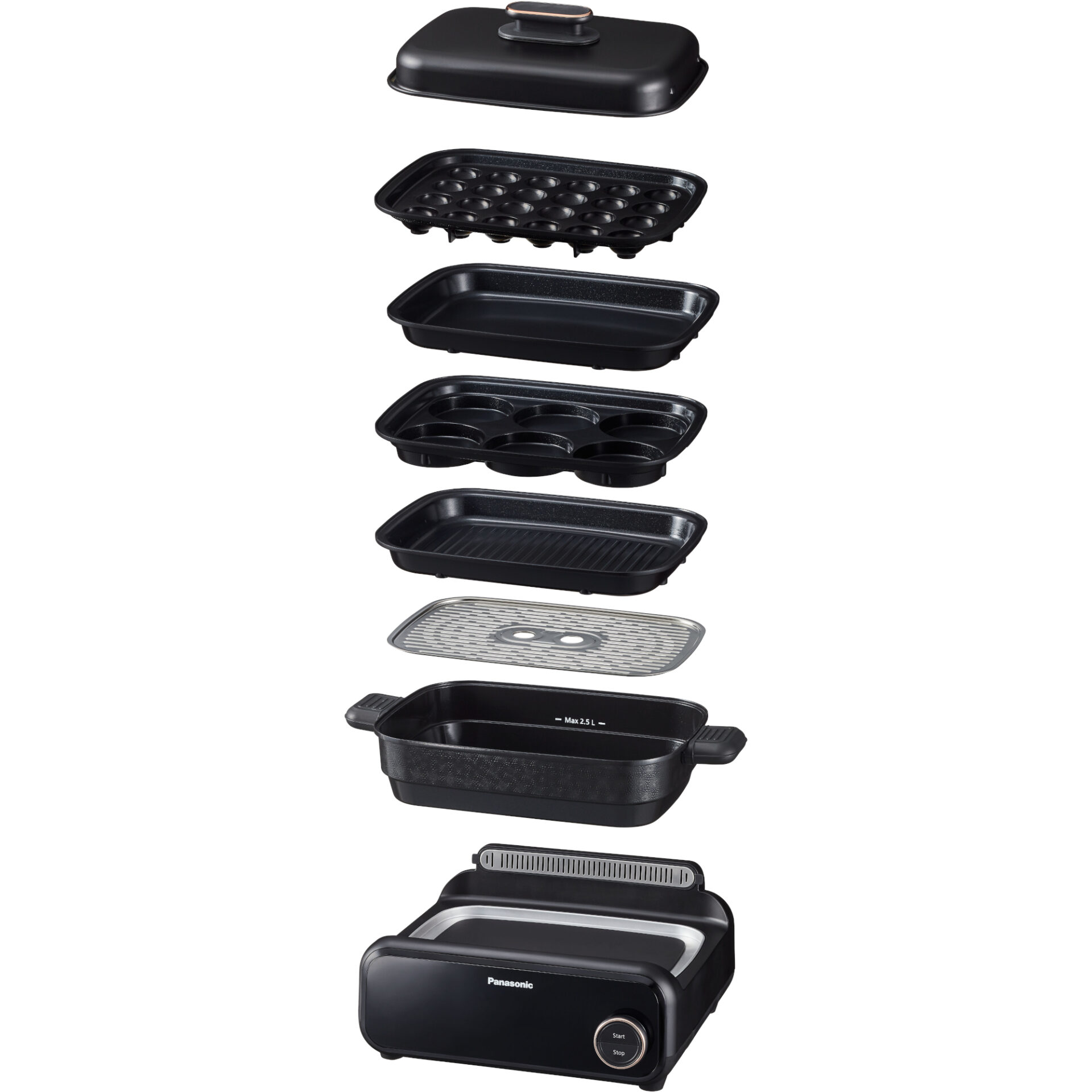 - 6 ľahko vymeniteľných varných dosiek/hrniec (vhodné do umývačky riadu)Grilovacia doska, parná doska, doska na palacinky, hlboký hrniec, plochá doska a doska na párty občerstvenie/takoyaki
